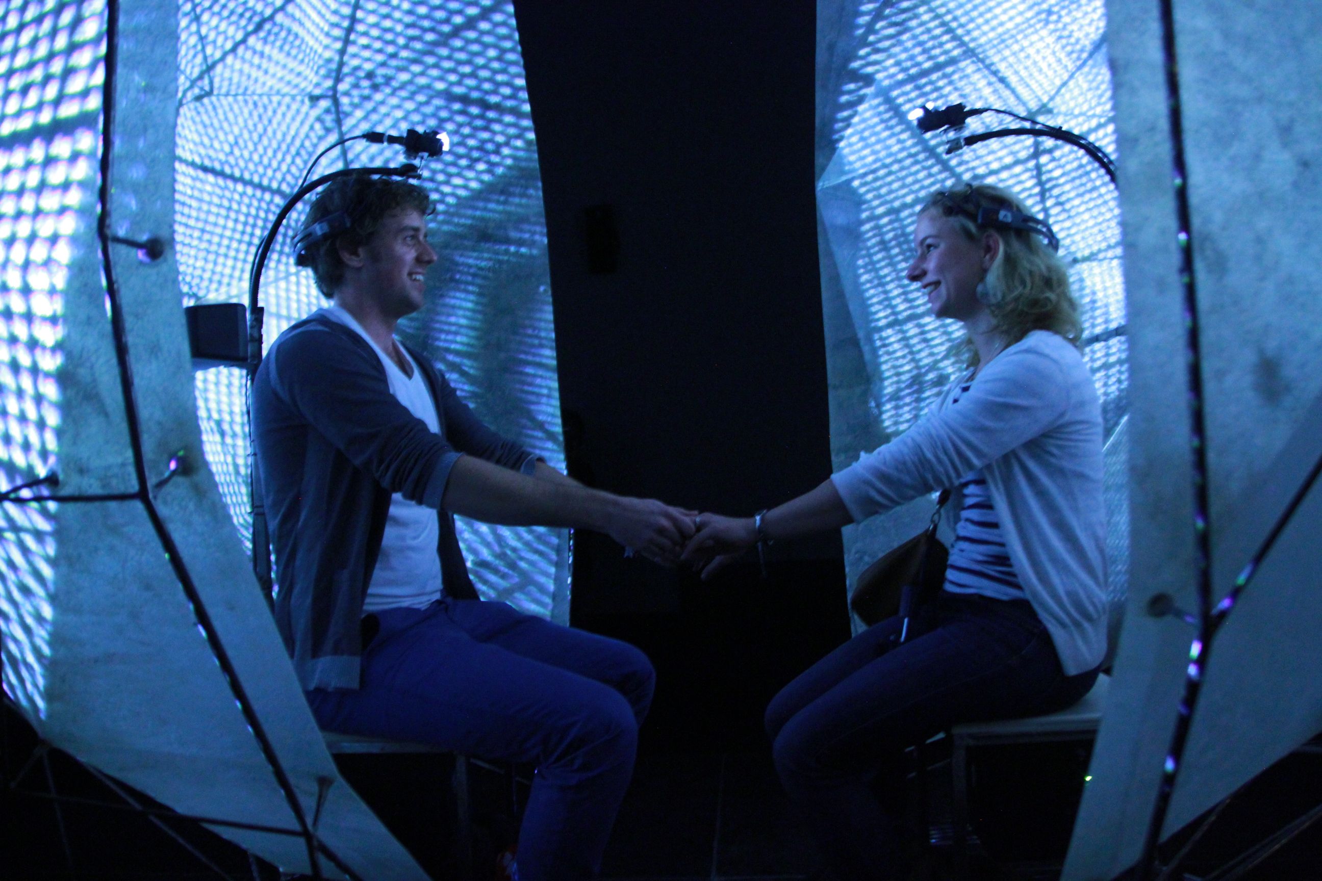 ‘Participants wear a headset which is used to measure their brainwaves. Subsequently, they also get to see a visual and auditory representation of this themselves If the brainwaves are on the same wavelength, that results in harmonious colours and music. If they are not on the same wavelength, audiovisual chaos ensues. ‘We do this no only to create an experience, but also to make the research tangible for the participants,’ explains the neuroscientist. ‘Moreover, this appears to have a beneficial effect: people who are more aware of the feedback also show more synchrony in their brain patterns.